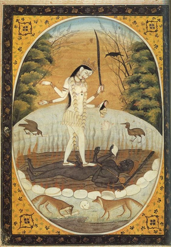 Now, while the unexpectedness of a White Kali is remarkable in and of itself (indeed, in a certain sense, it might even be thought of as ‘oxymoronic’ – Kaal, after all, means ‘Blackness’, inter many alia); what makes this fine 17th century painting a worthy Friday Night Devotional (A)Art(I) posting goes rather beyond that.