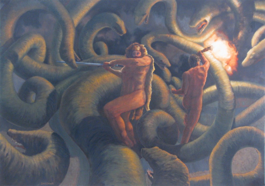 The results of Iolaus’ actions (immanentizing the wise guidance of Athena to the pair) , are not only the Hydra’s demise – but a denial of the ‘credit’ for the kill to Herakles by the taskmaster Eurystheus. Eurystheus, the figure responsible for directing Herakles off upon his penitential quests (and more upon *that* also, to come!), argued that the Hydra-slaying should not count against Hercules’ tally of ten as it had not been Herakles Who had killed the creature.