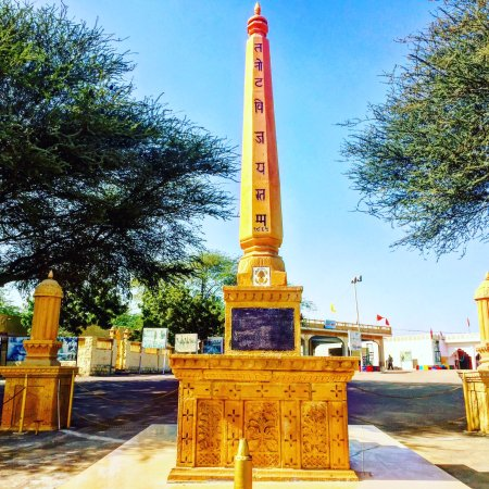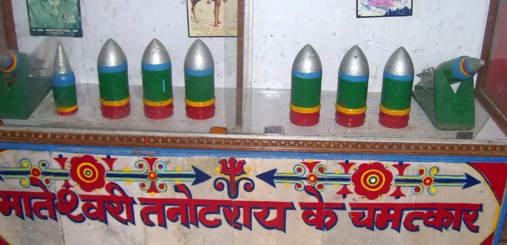 Today, at Tanot Mata, there stands a Vijaya Sthambha [Vijaya – Victory; and a Stambha is a pillar or post, in archaic times, the designation for the sacral post that was at the heart of many Vedic rites, with a correlate in the Axis Mundi at the heat of the world or the Irminsul of the Norse/Germanics, and in modern times represented also by the ShivLing that is the Shaivite Altar in most Hindu Temples], erected to commemorate the stunning victory at Longewala nearby. It is accompanied in its commemoration via various of the unexploded (although I presume subsequently defused!) ordnance that was hurled against the Temple in 1965, on display in a BSF museum also located on the grounds of the modern site.