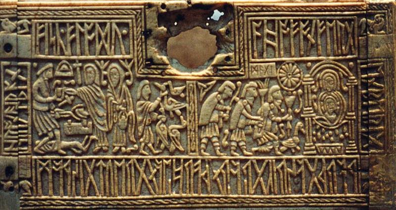 Although I had chosen this exquisite piece to illustrate the Christmas commentary for another reason – for if you look closely, upon the right side of the paneling, you can see a Germanic rendering of the Adoration of the Magi [‘Magi’ being spelled out in runes] of the infant Christ in the arms of Mary in the manger.