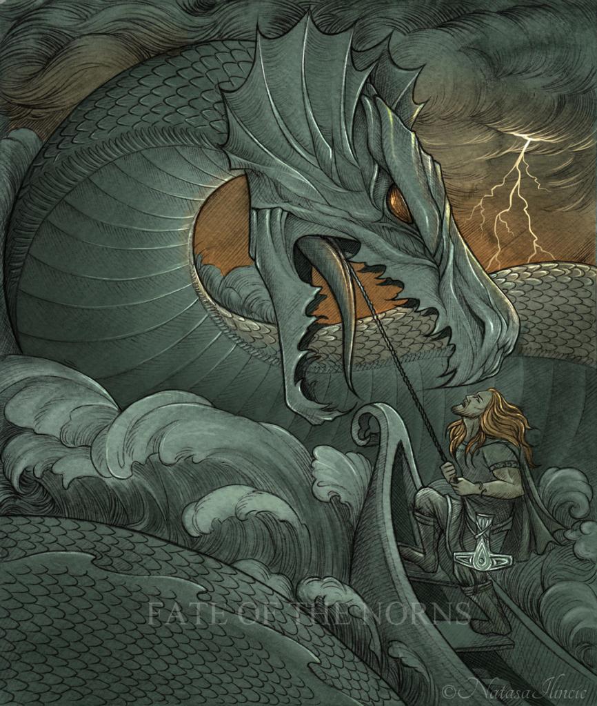“In the very moment when Thor clutched his hammer and raised it on high, then the giant fumbled for his fish-knife and hacked off Thor’s line at the gunwale, and the Serpent sank down into the sea. Thor hurled his hammer after it; and men say that he struck off its head against the bottom; but I think it were true to tell thee that the Midgard Serpent yet lives and lies in the encompassing sea. But ‘Thor swung his fist and brought it against Hymir’s ear, so that he plunged overboard, and Thor saw the soles of his feet. And Thor waded to land.”