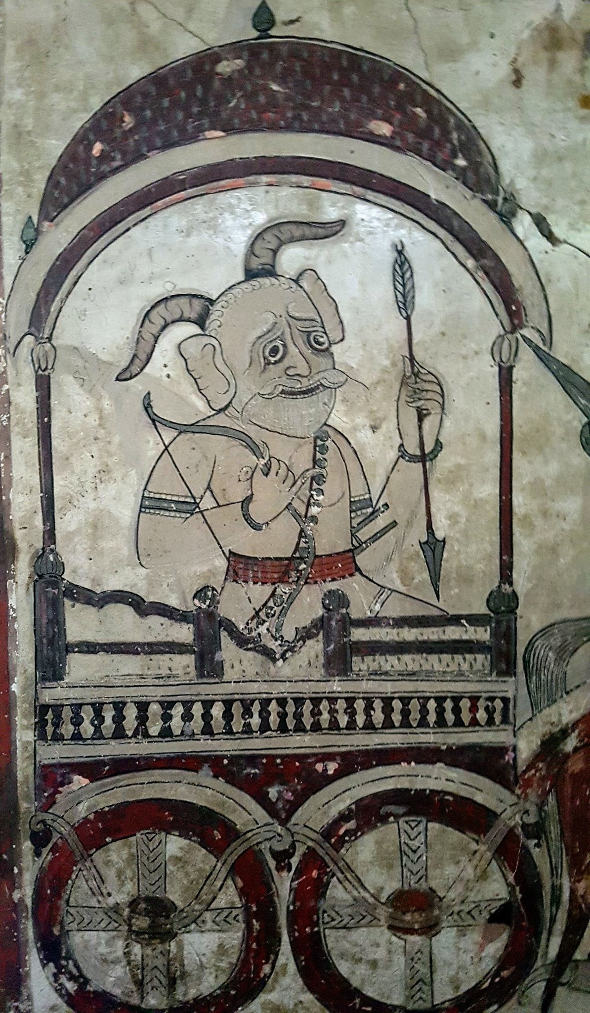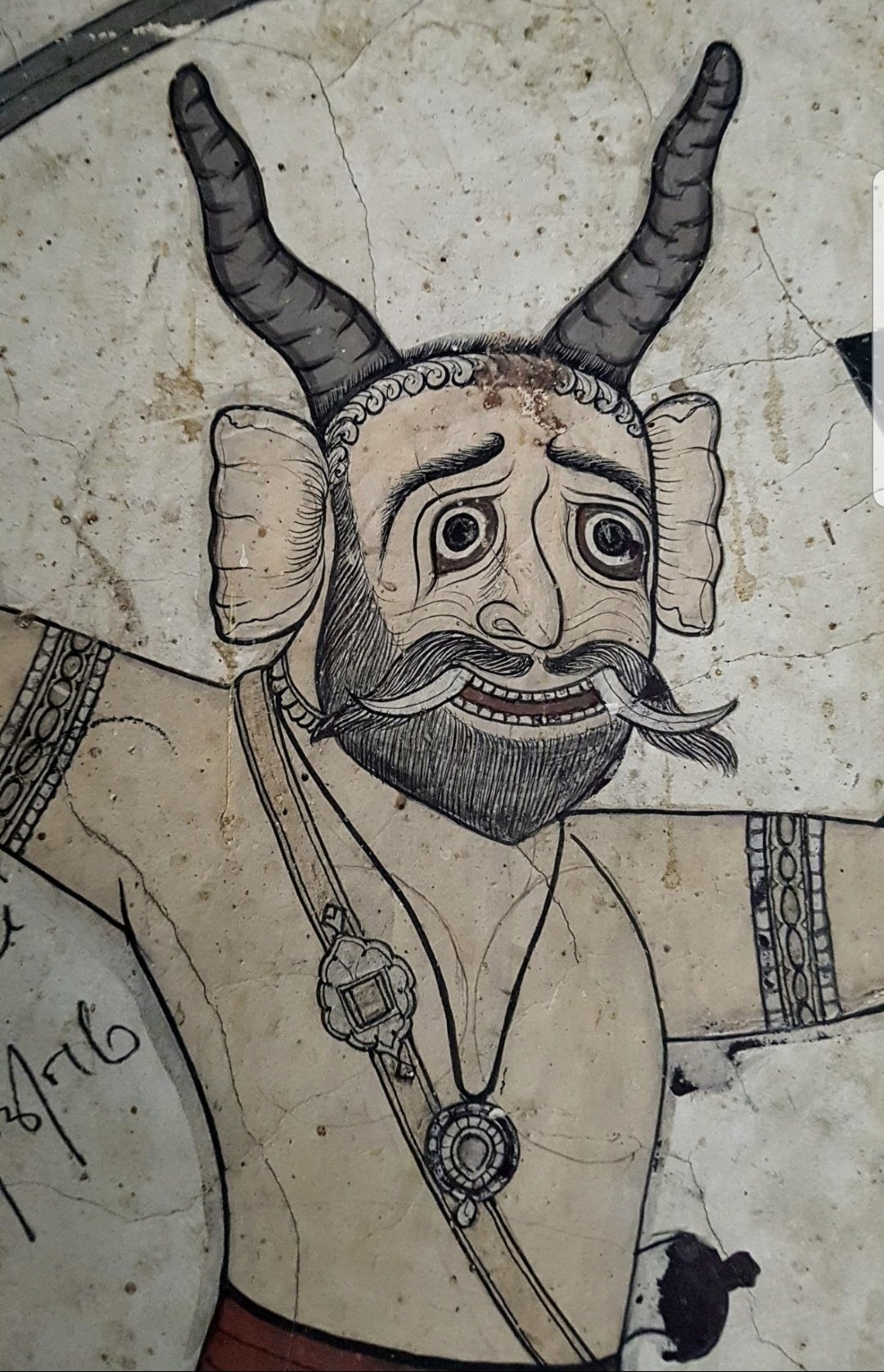 Unfortunately, they were recently damaged by a renovation effort by the local Mandir’s committee. Perhaps understandably, they had sought to ‘improve’ the structure using cement – which ran into heritage protections, and therefore made the work illegal. The work has now been stopped – although not afore the damage to the paintings had already occurred 😦