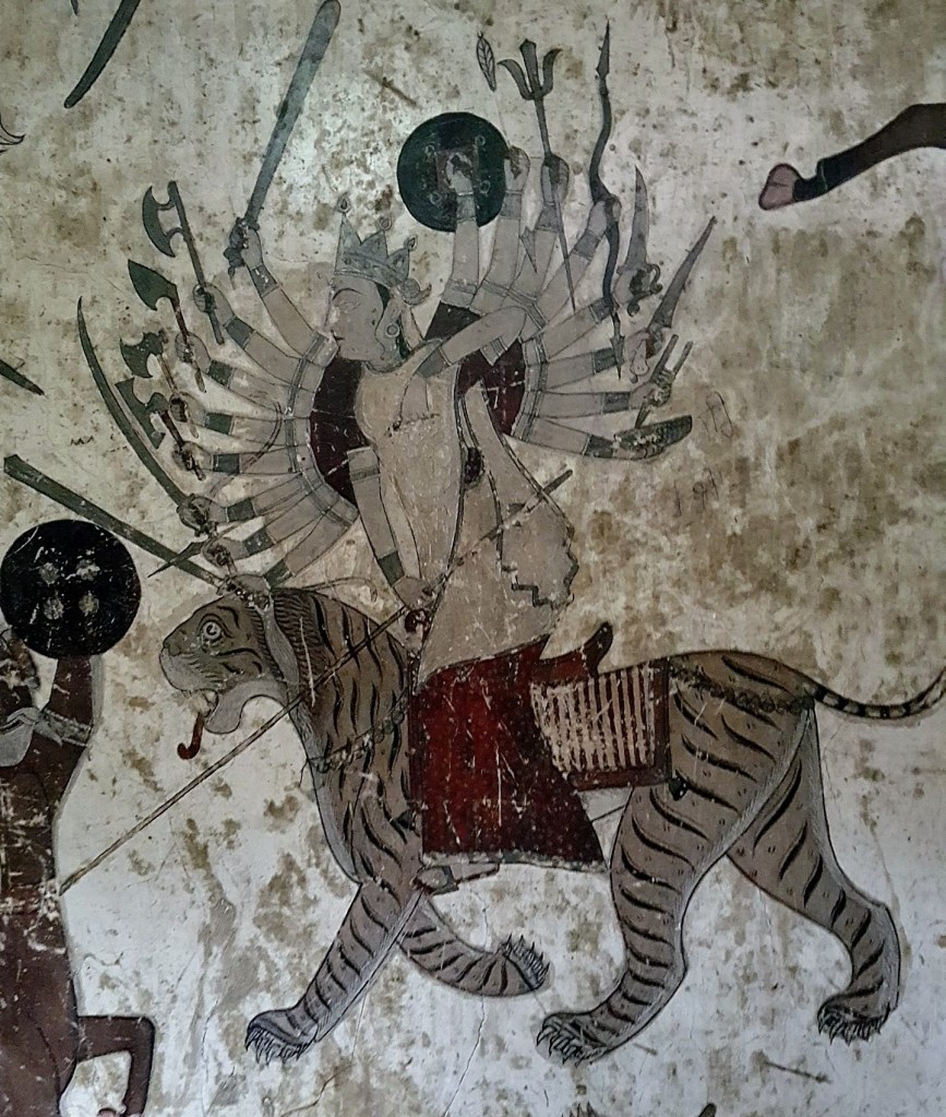 These absolutely beautiful frescos are from a Devi temple more than a quarter of a millennium old in Chamba, Himachal Pradesh. The name of the site is, aptly enough, Devi Kothi – and the presiding form of the Goddess is Chamunda.