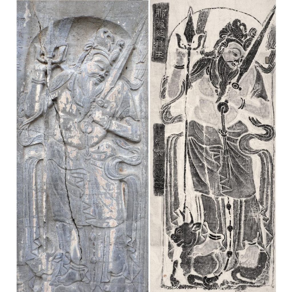 Well, there’s something curious going on here. This fine carving is from the Lingquan temple complex in Anyang, China. It would be easy to declare it to be a rather Sinicized depiction of Lord Shiva, found in a Buddhist context. There are most certainly an array of iconographic features we would associate easily with Mahadev – most notably, the presence of the Trishula [Trident] and Bull .
