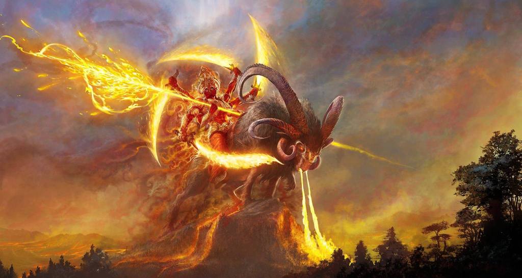 “The sacrificial altar became adorned with Rishis skilled in sacrifice and competent to perform all acts appertaining thereto, with [bundles of sticks] of sacrificial fuel, and with blazing fires. And it looked exceedingly beautiful in consequence of the sacrificial plates and vessels all made of gold. All the foremost ones among the Gods took Their seats on it. The platform was further adorned with Sadasyas all of whom were high regenerate Rishis. I have heard from the Rishis that soon something very awful occurred in that sacrifice. It is heard that a creature sprang (from the sacrificial fire) scattering the flames around him, and whose splendour equalled that of the Moon Himself when He rises in the firmament spangled with stars. His complexion was dark like that of the petals of the blue lotus. His teeth were keen. His stomach was lean. His stature was tall. He seemed to be irresistible and possessed of exceeding energy. Upon the appearance of that being, the earth trembled. The Ocean became agitated with high billows and awful eddies. Meteors foreboding great disasters shot through the sky. The branches of trees began to fall down. All the points of the compass became unquiet. Inauspicious winds began to blow. All creatures began to quake with fear every moment. Beholding that awful agitation of the universe and that Being sprung from the sacrificial fire, the Grandsire said these words unto the great Rishis, the gods, and the Gandharvas. “This Being was thought of by me. Possessed of great energy, His name is Asi (sword or scimitar). For the protection of the world and the destruction of the enemies of the Gods, I have created Him.”