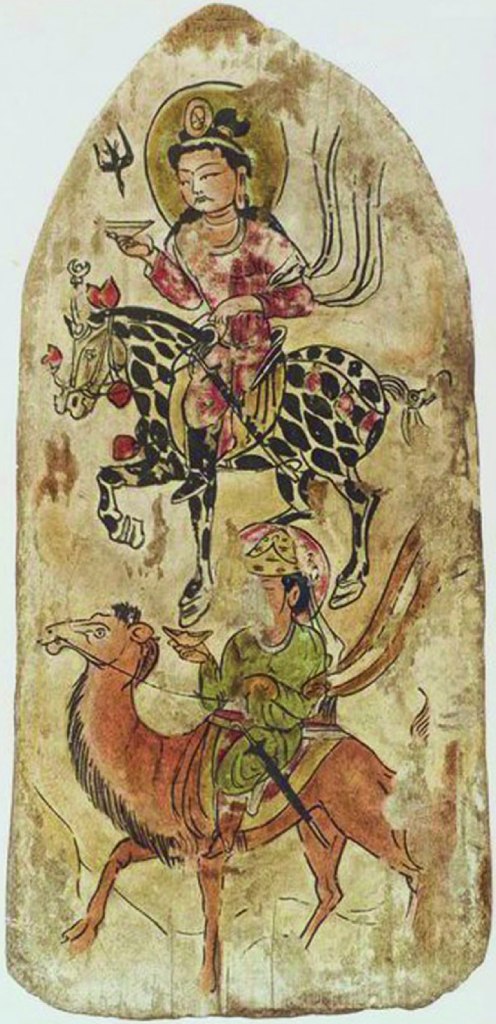 This ‘blind-spot’ turned up quite prominently when I was researching the figure depicted in the top portion of this image. The bottom portion, there was some reasonable suggestion that this camel-riding figure was somewhat equivalent to the Zoroastrian Verethragna; yet the top? Some speculation abounded, but no definitive answers could be ventured. The situation was considerably complicated further via the occurrence of near-identical depictions of this mysterious figure on horse-back, carrying a bowl, and with one or two black birds swooping (potentially into the vessel) which have also been found – including a set of eight such figures in one particular rendering, bearing the enigmatic legend: “The donor Budai ordered to draw the eight spirits [gods] there. May they protect him”.