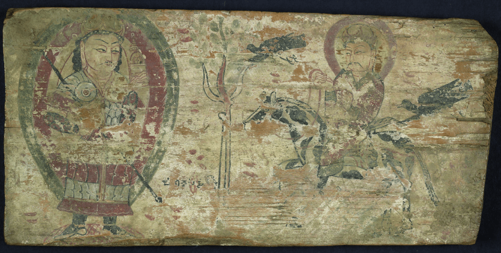 The figure on the left has not been identified – indeed, likely cannot be identified with any surety. One proposal from entirely within the Buddhist sphere would be a Vaishravana depiction. However, amongst the Khotanese’ Sogdian neighbours (part of that same East Iranic and trading sphere), it is well remarked upon that what is often identified as Vaisravana … draws heavily from the Hindu iconography of Lord Skanda. The lack of these (Hindu) elements may, therefore, ironically render the Buddhist (co-)identification less likely.