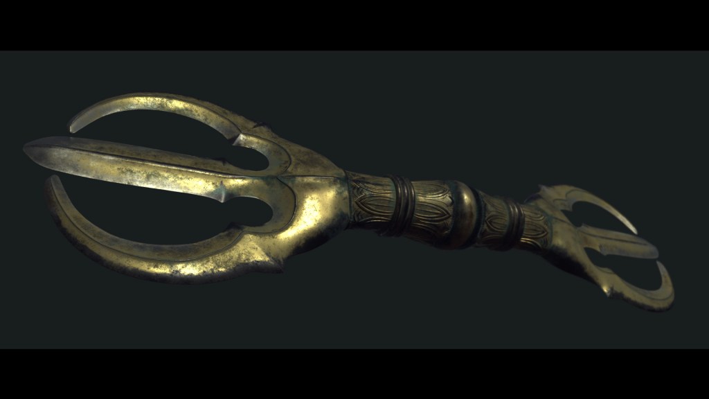 This may, in addition to reminding of the multi-pronged forking lightning, also recall the actual more ‘solid head’ Gada [‘Mace’ / Club] – except with that ’emptiness’ dimension the Buddhists are often rather keen on at the center. [Although it should also be noted that there are an array of other formulations which turn up in Buddhist usage – including with points splayed out; and, of course, incorporation into other things like axes, hammers, daggers, flensing knives, etc.]