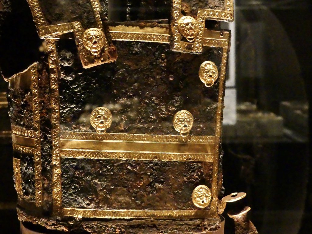The armour itself is ceremonial – particularly the rather immense shield, which bears some seriously, seriously impressive iconography that we may perhaps return to explore at some later time. Its major composition is iron – hence why it has rusted to its present colouration as can be seen on the Thorax and Helmet; whilst the gold has remained much as it was.