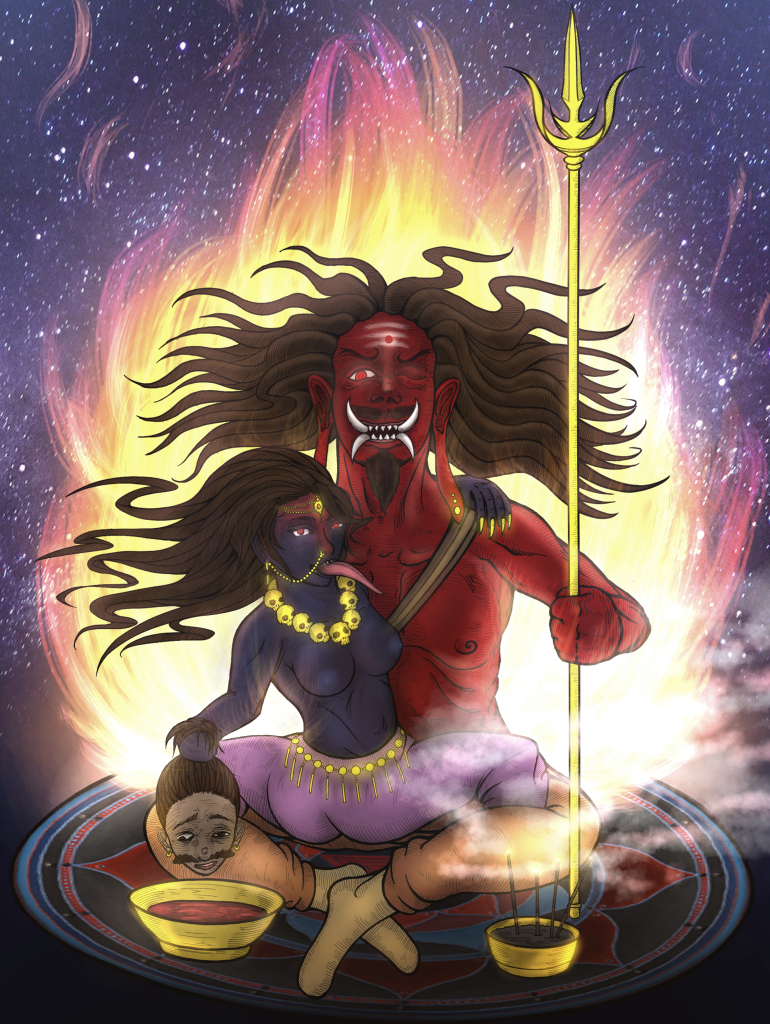 There is, of course, quite a lot more that can and almost certainly should be said upon various iconographic details that HC has added to this piece (we particularly approve of the facial hair ! The darkened complexion to His Consort also recalling the situation not only of Lady Kali, but also Skaði and other Visages of Her; whilst the situation of Their being Together in the Flame finds additional resonancy with some certain Vedic metaphysical as well as ritualine understandings that we have stoked most capaciously elsewhere ) .