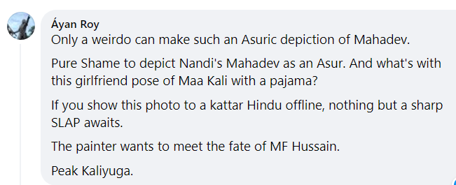 Now, as applies his charge that Gods are never depicted romantically linked or in posing suggestive of such (his exact phrasing was, and I quote: “this kind of intimation is what Gods are never depicted. Like they are some bf-gf stuffs. It looks and feels Tamasic in every sense.”, or “And what’s with this girlfriend pose of Maa Kali with a pajama?”) … this is prima facie wrong. I have some further thoughts on this that I shall detail elsewhere (having just bombarded a noble associate’s chat-window with a few of them, in earnest 😛 ) … but it occurs to me that there is something most peculiar indeed going on if he genuinely does not believe it proper and appropriate to depict the God and Goddess Who are acknowledged as the Divine Couple with a union so perfect that They are occasionally depicted literally ‘as one’ (viz. Ardhanarishvara) … as expressing affection via Devi having Her Arm about Mahadev’s shoulders in a half-embrace. Especially because there are quite an extensive array of sculptures and scriptural elements that would appear to flagrantly offend his sensibilities.