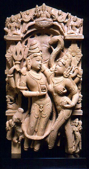 This is not an isolated occurrence, either – an exquisite north Indian (likely Rajasthani or of Uttar Pradesh) piece of about a thousand years’ antiquity, carved of pink sandstone and depicting (so it is said) the Marriage of Lord Shiva & Lady Parvati … goes even further. This time, one of Lord Shiva’s is directly upon one of Devi’s divine breasts; and it appears from the expertly poised position of the bodies that She is drawing Him in closer to Her.