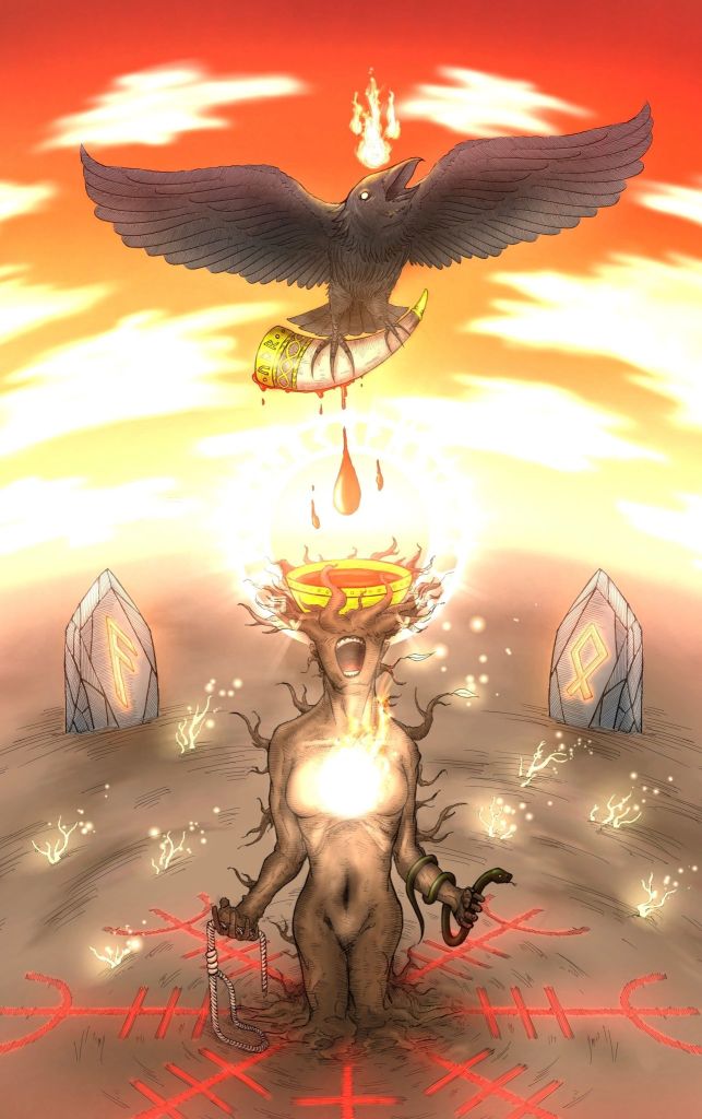 Except there, the humans in question are already, well, human – and are rendered more than human through their imbibing of that which the avian form of the Sky Father brings. (And you can see a subtle allusion going on here – HC went off and researched how to designate that Mead-Horn as bearing ‘óðr’ essence-empowerment , hence the Runic inscription upon the horn. We should also think of the Óðrerir name for the major Vessel to the Mead of Poetry – one of Three).