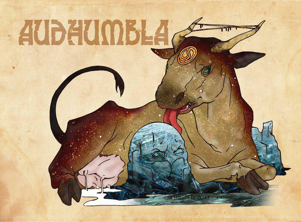 Now, Auðumbla is rather pointedly relevant for us as, we may say, the Primordial Mother. It would be tempting to suggest, in light of Vedic evidence, the true First Being – but strictly speaking, if we are going just by the textual evidence of the Gylfaginning … well … that would lead to a bit of an argument. Ymir is mentioned first in the text, and you can certainly suggest that Ymir emerges first from the ice. However the fact that the Cow emerges, to quote the Brodeur translation, “Straightway after the rime dripped”, I think means one can read it the other way, too – that is to say, there is enough latitude within the text to allow for the Cow to have come forth immediately following the beginning of that thawing process, and Ymir having resulted from the ‘dripping’ that had gone on long enough to actually thaw a suitably ‘giant’ specimen.