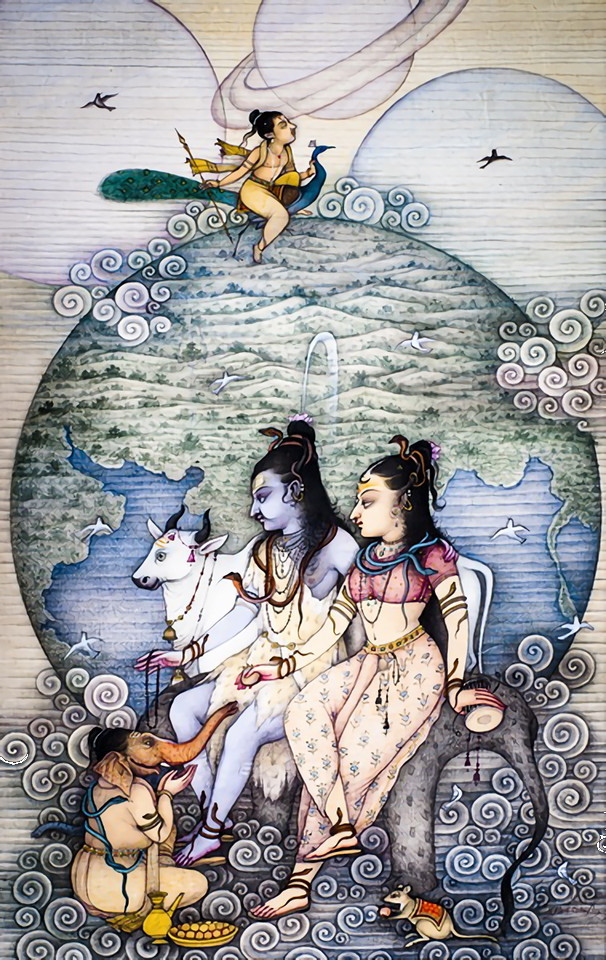 A fine depiction of the popular mythic episode in which Lords Skanda & Ganesha engage in a ‘race around the world’.