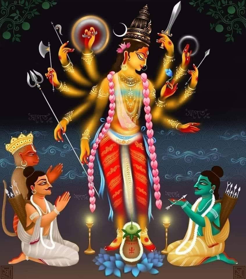 She is Invoked as Chandika – and as the Devi Puran Mahabhagwat Ramayan [Chhawchharia translation] puts it, “the most ferocious and fierce, glorious and splendorous Chandika [is] worshipped and invoked by Sri Ram for the express purpose of eliminating this wart-like demon from the world for the greater welfare of the rest of creation, destroyed him along with his kith and kin.”