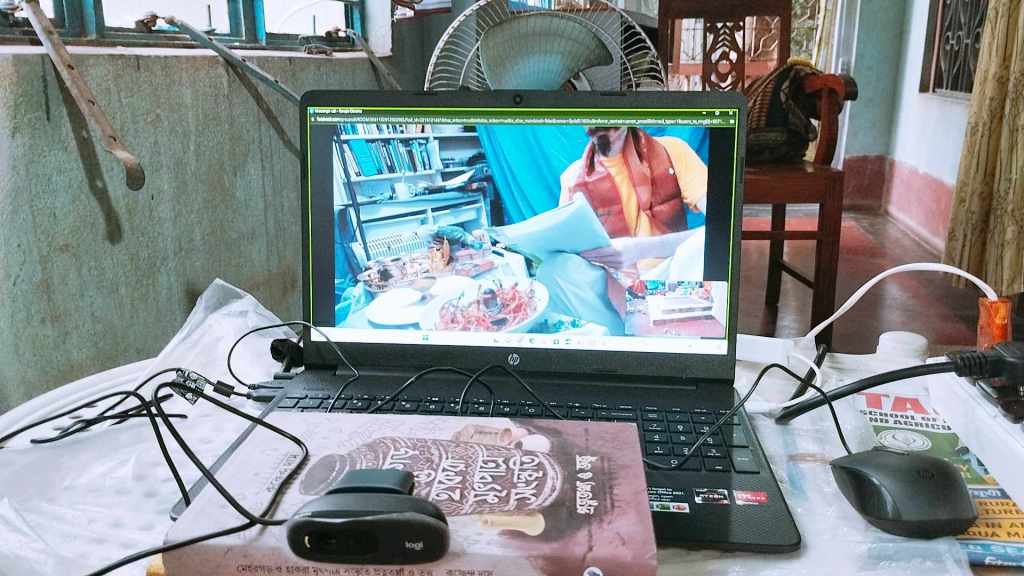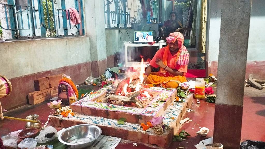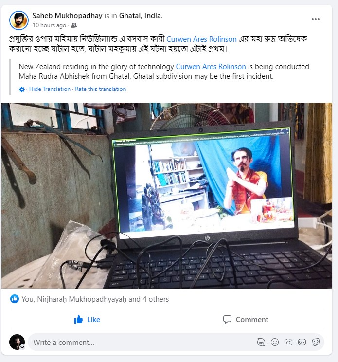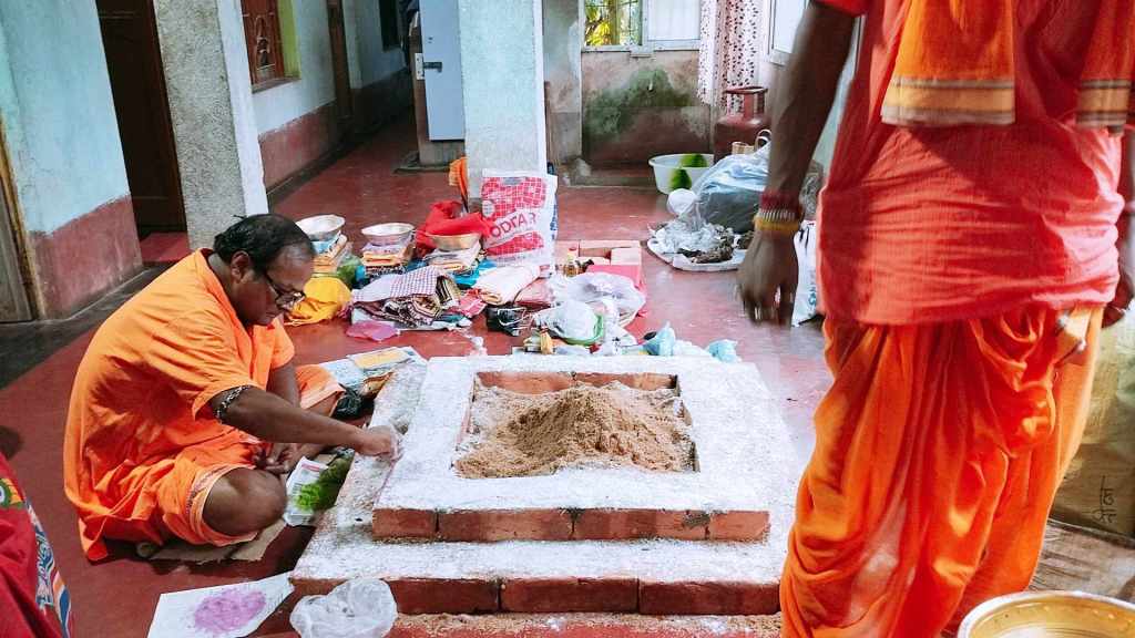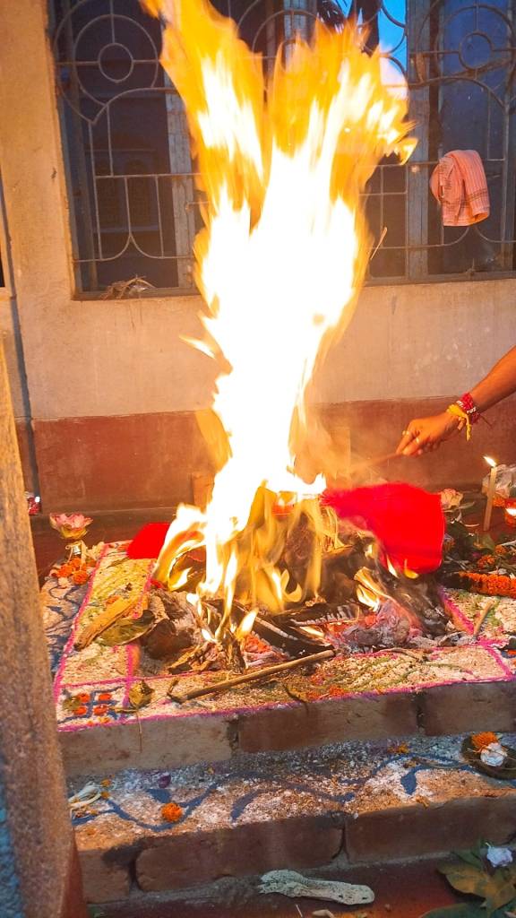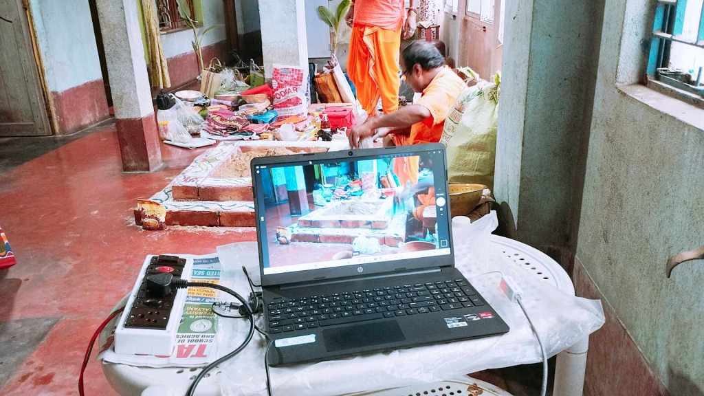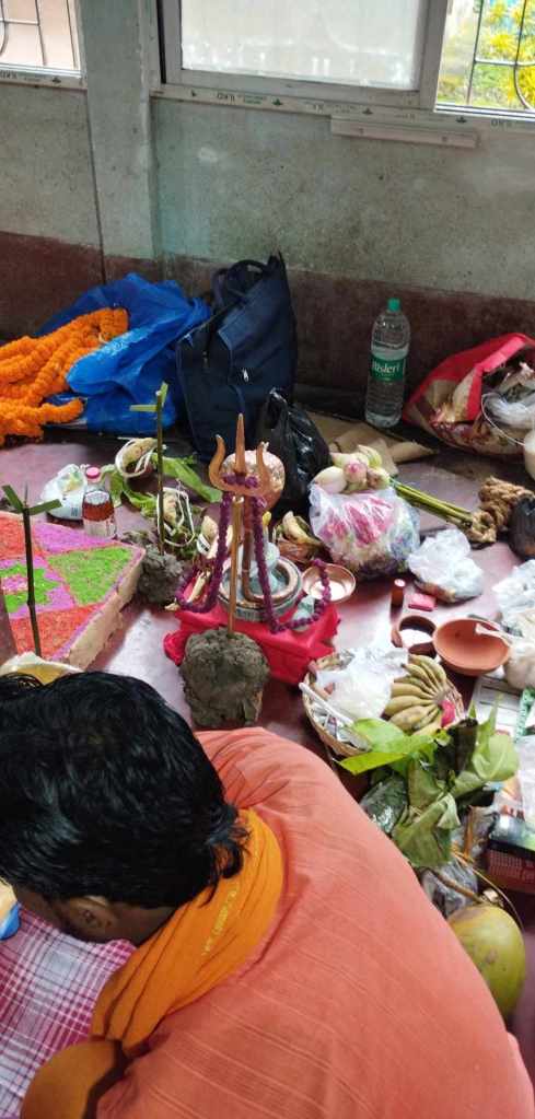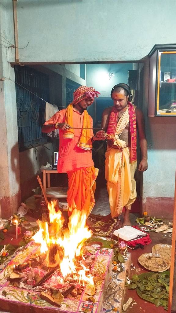 The ‘heavy lifting’ of the operation was conducted by a very traditional Bengali Brahmin clan (and yes, I said “clan” … because this involved multiple priests operating simultaneously – along with their wives & mothers; also of their number, the young gentleman whose photography this album is comprised of), along with our close comrade, Nirjharah Mukhopadhyayah … whom you can see in various shots not only carrying out various ‘traditional’ ritual operations, but wearing various headphones / microphone arrangements (so as to facilitate greater coherency of co-ordination for ritualistic actions with me over here on the other side of the world).