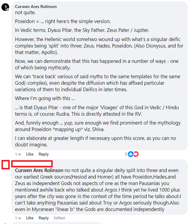 I should clarify that I’m not posting this with an intent of having a go at the gentleman who’d raised the counterclaim (hence, in part, why I’ve anonymized his comment in the cap below) – but rather, because various of the elements in my reply might be of a broader interest (the situation as to the ‘Refraction’ of the Indo-European Sky Father deific being a most important one, after all, in terms of understanding the relevant theology).