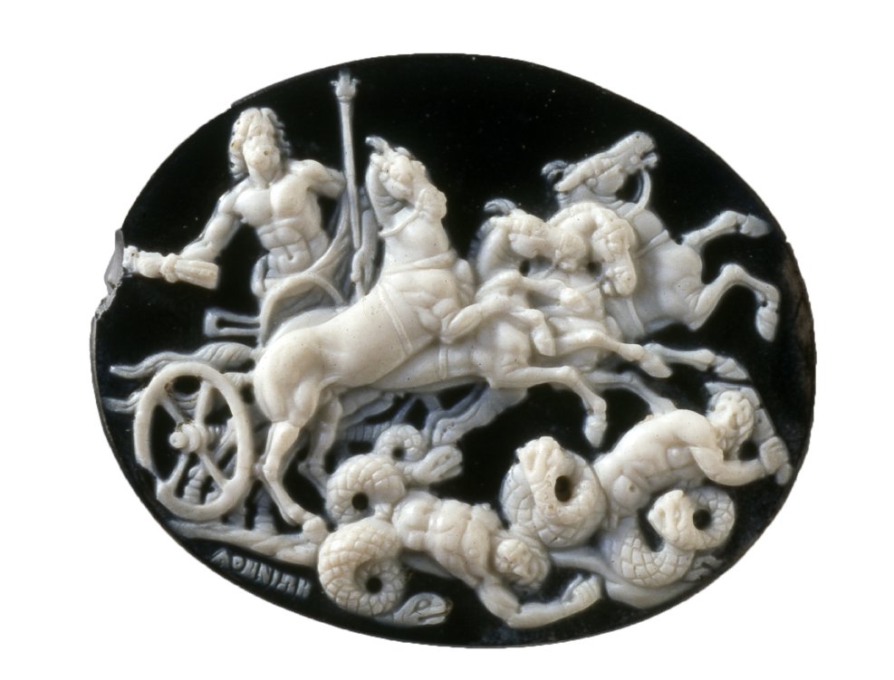 And, because it’s a very, very cool illustration for the concept – here’s a beautiful 2nd-3rd Century (BC) cameo of Athenion (you can see the signature down bottom left) which depicts Zeus in a war-chariot, preparing to electrify the Gigante(s) that He hasn’t already run down.