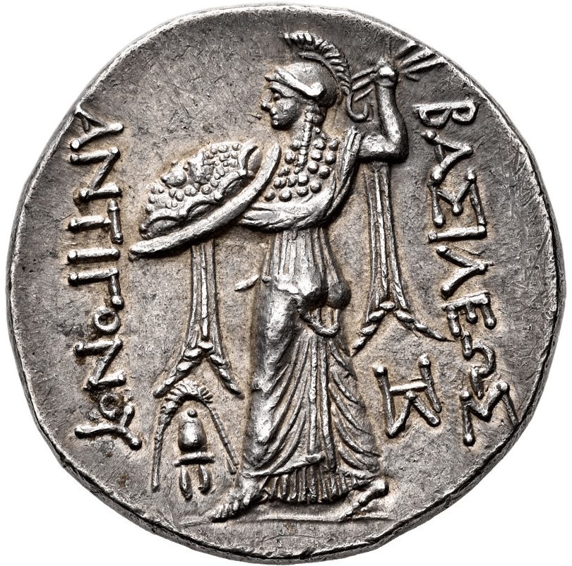 These numismatic iterations tend to feature Athena wielding Thunderbolt(s) (other representations for the same Aspect elsewhere in the Hellenic world tended to have a Spear there – and this cross-pollinated with the Macedonian iconography so you did also get almost exactly the same posing / stylistic features as the thunderbolt-wielding Athena Alkidemos, but wielding a Spear, on some of post-Macedonian successor coinage issues as well). This is also, as it happens, the same basic type (in terms of Athena Aspect) to those glorious renditions of the Seleucids – most prominently, Seleucus I Nikator – which could feature Her riding in an elephant quadriga chariot (Seleucus really liked those War-Elephants he got off Chandragupta Maurya .. and for good reason).