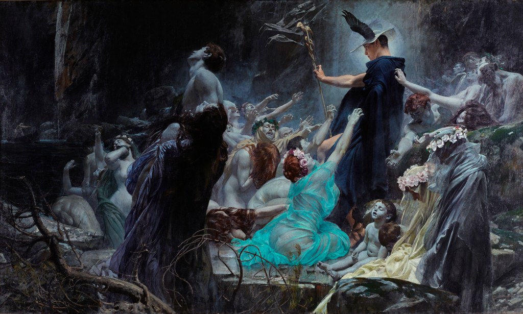Namely, people looking to affirm an accuracy for that well-known ‘Interpretatio’ from Tacitus, whereby Odin is inferred to correlate to Roman Mercury / Greek Hermes, a prominent psychopomp (the Classical figure pictured here in Adolf Hirémy-Hirschl’s ‘Souls of Acheron’).